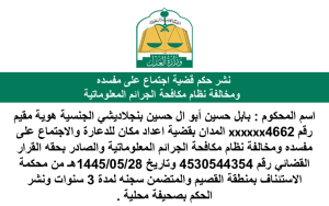 نشر حكم قضية مساس بالنظام العام ومخالفة نظام مكافحة الجرائم المعلوماتية