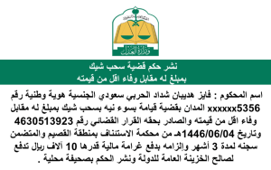 نشر حكم قضية سحب شيك بمبلغ له مقابل وفاء اقل من قيمته