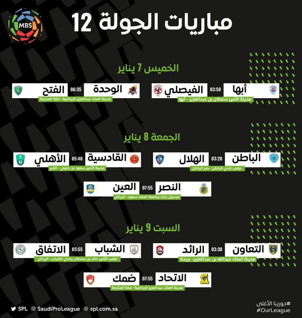 ويستضيف الشباب صاحب المركز الثالث بـ 19 نقطة، فريق الاتفاق بنقاطه الـ 17 في المركز السابع على ملعبه بالرياض، بينما يلتقي الاتحاد مع ضمك في آخر مباريات الجولة 12 على ملعب مدينة الملك عبدالعزيز الرياضية بمكة المكرمة.