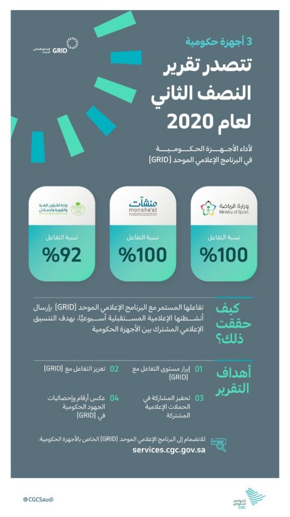 وقدمت وزارة الرياضة خلال النصف الثاني من العام 2020م جهودًا كبيرة من خلال تعاونها المستمر مع الجهات الحكومية، ضمن إطار تعزيز دور المشاركة والتفاعل مع التواصل الحكومي والبرنامج الإعلامي الموحد”GRID”، مما أثمر نجاحًا تشاركيًّا فاعلاً بين وزارة الرياضة والجهات الحكومية.