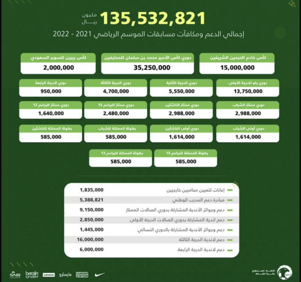 كما تم رفع قيمة مكافآت مراكز الفرق في دوريات الدرجة الثانية والثالثة والرابعة وبطولات الفئات السنية إلى 26 مليونًا و964 ألف ريالٍ بعد أن كان مجموعها لا يتجاوز مليوني ريال.