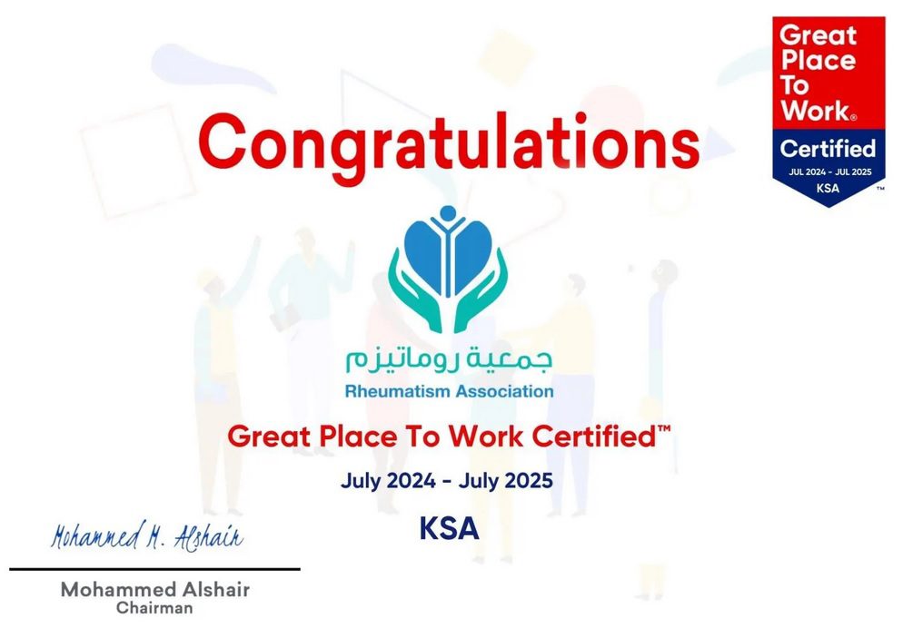 الجمعية الخيرية لرعاية مرضى الروماتيزم تحصل على معيار اعتماد أفضل بيئة عمل