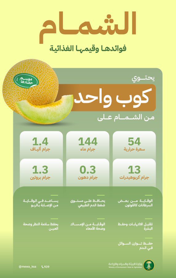 وأوضحت الوزارة ضمن تقرير حملة “موسم حصادها”، التي تستهدف نشر المعرفة بالمنتجات الزراعية المحلية، أن الشمام تُعتبر من الفاكهة الصيفية الغنيّة بالعديد من الفوائد الصحيّة، والمواظبة في تناولها يحفظ توازن السوائل في الدم، ويقي من بعض السرطانات كالقولون، ويحافظ على مستوى ضغط الدم، ويساعد في الوقاية من الإصابة بالربو، ويقلل من الالتهابات ويحفظ البشرة، ويقي من الإمساك ويحفظ صحة الأمعاء، كما يحفظ سلامة النظر وصحة العين، لافتةً النظر إلى أن استهلاك فاكهة الشمام المنتجة محليًا في مواسم حصادها يحقق أقصى فائدة غذائية وصحية من استهلاكها.