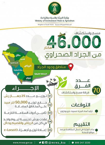 نجحت وزارة البيئة والمياه والزراعة في استكشاف ما يقدر بـ 46 ألف هكتار، حيث جرى معالجة 10000 هكتار بكمية مبيدات بلغت 6710 لترات، وذلك في مناطق الرياض ومكة المكرمة والمدينة المنورة والمنطقة الشرقية وحائل وتبوك ونجران.