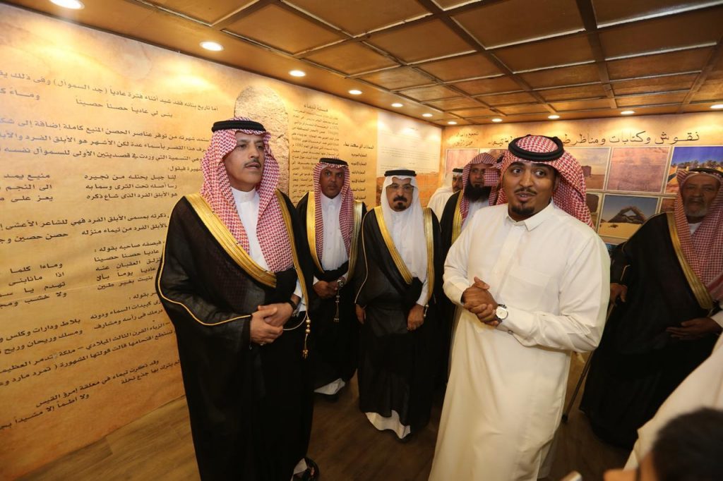 وتابع ” احتوى المعرض على صور لـ ” نقش نابونيد” ويقع جنوب غرب تيماء 60 كلم وهو نقش للملك نابونيد وعمر هذا النقش اكثر من ٢٥٠٠ سنة، حيث ترى من خلاله الملك نابونيد راكبا حصانا حمدانيا ملجم بلجام حار واللجام الحار يدل على الخيل الجامحة القوية، وبحسب النقش فقد اختار الملك الحصان الحمداني لأنه أقوى ما يتحمل في الحروب، ويرى في النقش الملك البابلي جادلا لحيته كطريقة ملوك بابل وجامعا شعره خلف خوذته راكبا الحصان بطريقة العدو ومعه سوط بيده اليسرى يضرب به قطاة الحصان ليحثه على المشي، اما النقش الثالث فهو نقش حصاة النصلة وهي مقسومة إلى قسمين بالقرب من جبل النصلة تقع جنوب تيماء، ووجد على واجهتها رسوم وكتابات قديمة.