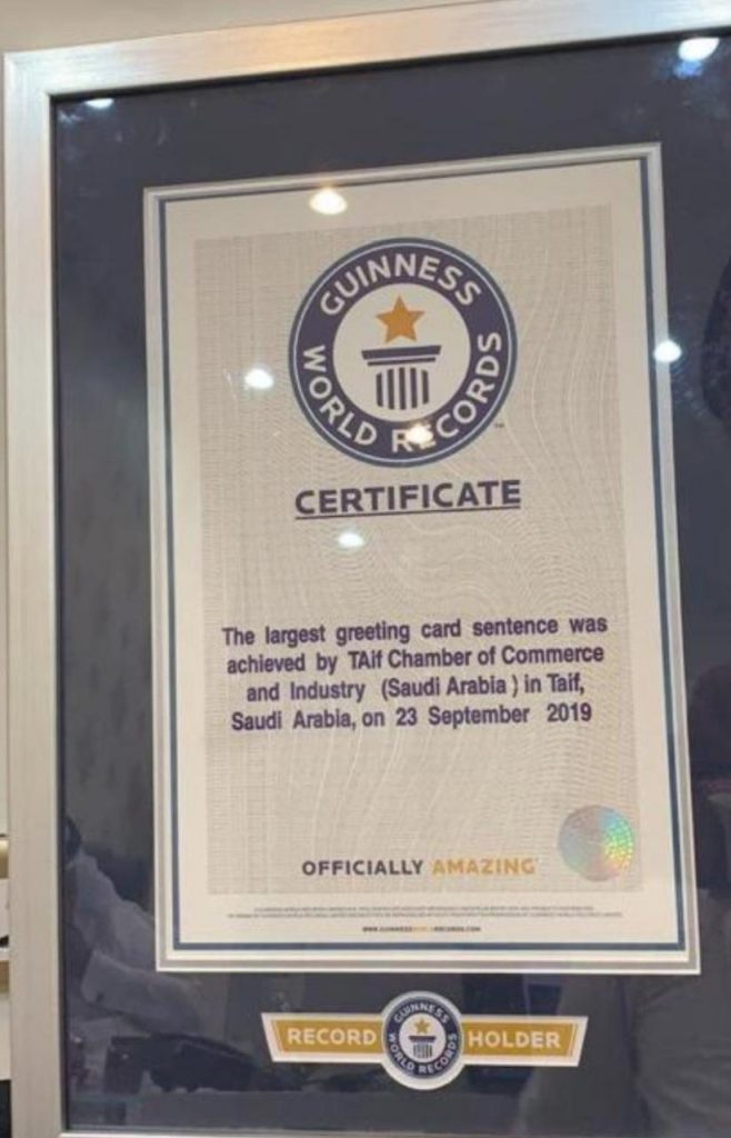 وسلم ممثل الموسوعة أحمد جبر شهادة موسوعة غينيس لنائب رئيس غرفة الطائف غازي القثامي, بحضور أمين عام الغرفة دسمان الفقيه, وفريق عمل الغرفة, وجاء هذا الإنجاز الجديد للغرفة من خلال لوحة تجاوز طولها 22 متر, وتم وضع كروت تهنئة اليوم الوطني عليها بصورة الملك سلمان وولي عهده, راسمة عبارة وطنية باسم (همة الطائف حتى القمة).