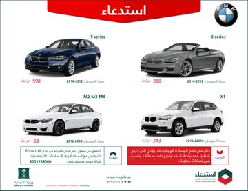 أعلنت وزارة التجارة عن توسيع حملة استدعاء عدد من طرازات مركبات BMW، وذلك لوجود خلل في نافخ الوسادة الهوائية لجهة السائق قد يؤدي، عند وقوع حادث، إلى خروج شظايا معدنية حادة تتسبب في إصابات خطيرة.