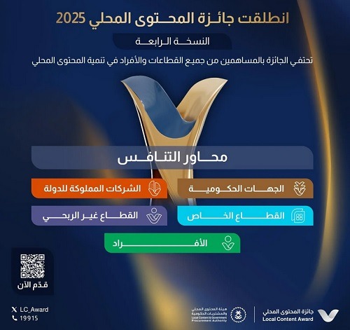 أعلنت هيئة المحتوى المحلي والمشتريات الحكومية عن فتح باب التقديم لجائزة المحتوى المحلي بنسختها الرابعة تحت شعار “نحتفي بإسهامك”، حيث تهدف الهيئة من خلال الجائزة إلى رفع الوعي بآليات المحتوى المحلي، وتعزيز التنافسية بين الجهات المشاركة، وتسليط الضوء على قصص النجاح الملهمة التي أسهمت في تمكين المحتوى المحلي.