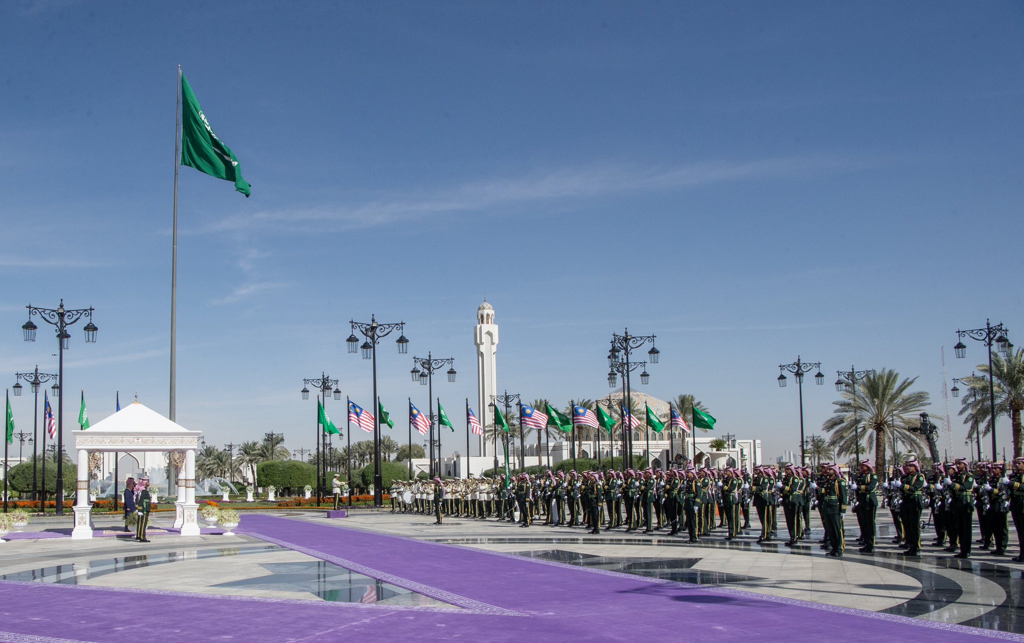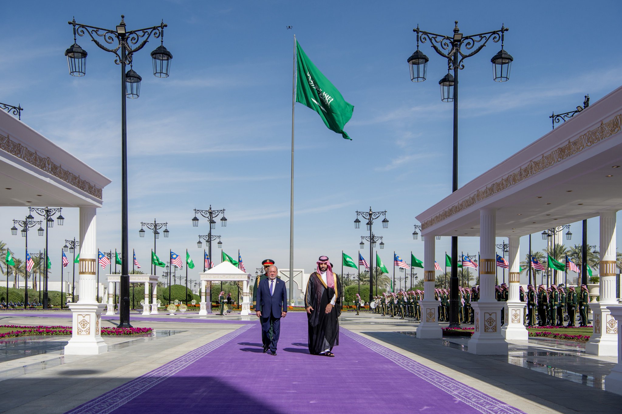 سمو ولي العهد يستقبل ملك ماليزيا ويقيم له مراسم استقبال رسمية في قصر اليمامة
