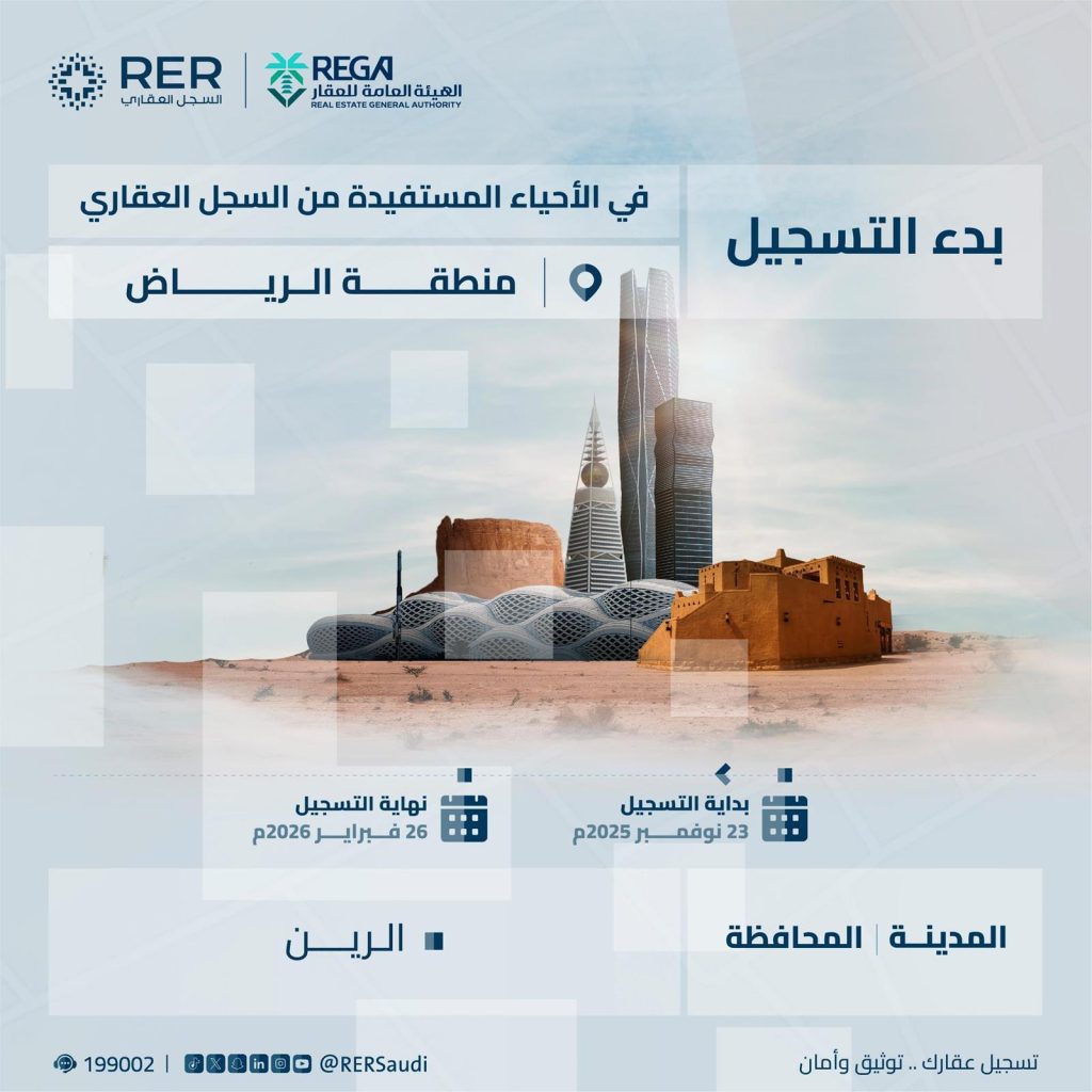 وحث السجل مُلَّاك العقارات الواقعة في نطاق الأحياء تسجيل عقاراتهم قبل نهاية يوم الخميس 26 فبراير 2026م، ويمكن التحقق من موقع العقار إذا كان ضمن المناطق المعلنة من خلال منصة السجل العقاري، داعيًا ملاك العقارات إلى تسجيل عقاراتهم من خلال منصة السجل العقاري www.rer.sa، أو تطبيق السجل العقاري، والتواصل مع مركز خدمة العملاء 199002، للاستفسار عن إجراءات وخطوات التسجيل، حيث يجب على ملاك العقارات تسجيل عقاراتهم خلال الفترة المحددة للاستفادة من خدمات السجل العقاري وتنفيذ التصرفات العقارية بيسـر وسهولة، وتفادي العقوبات والغرامات التي حددها نظام التسجيل العيني للعقار.