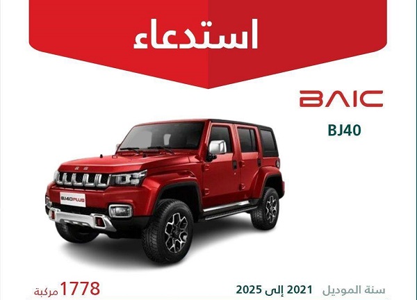 أعلنت وزارة التجارة عن استدعاء (1,778) مركبة “بايك” طراز “BJ40” سنة الصنع 2021م إلى 2025م، لخلل في معزز الفرامل قد يؤدي إلى تأثر عمل نظام أمان الفرامل أثناء القيادة؛ مما يزيد من خطر وقوع حادث.