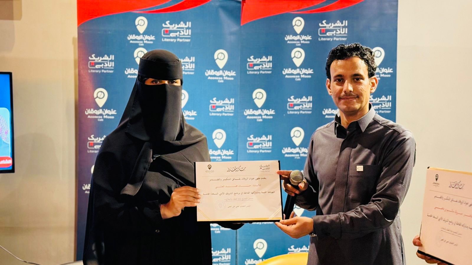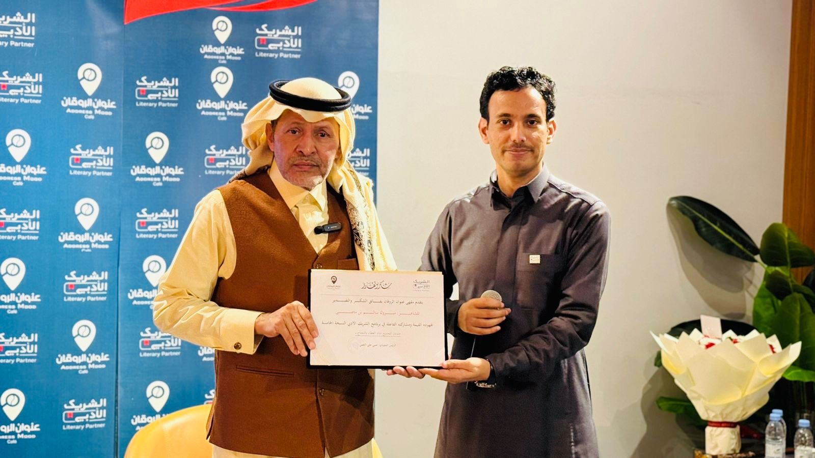 وفي ختام الأمسية، قام ممثل مقهى عنوان الروقان الإعلامي عيسى المرشدي؛ بتكريم الشاعر مبروك بن ماضي، تقديرًا لعطائه الأدبي وإبداعه الشعري ومشاركته الفاعلة في إحياء اللقاء كما تم تكريم والكاتبة حنان محمد تثمينًا لإدارتها للأمسية، وسط أجواء تعبق بالإعجاب والتقدير والامتنان.