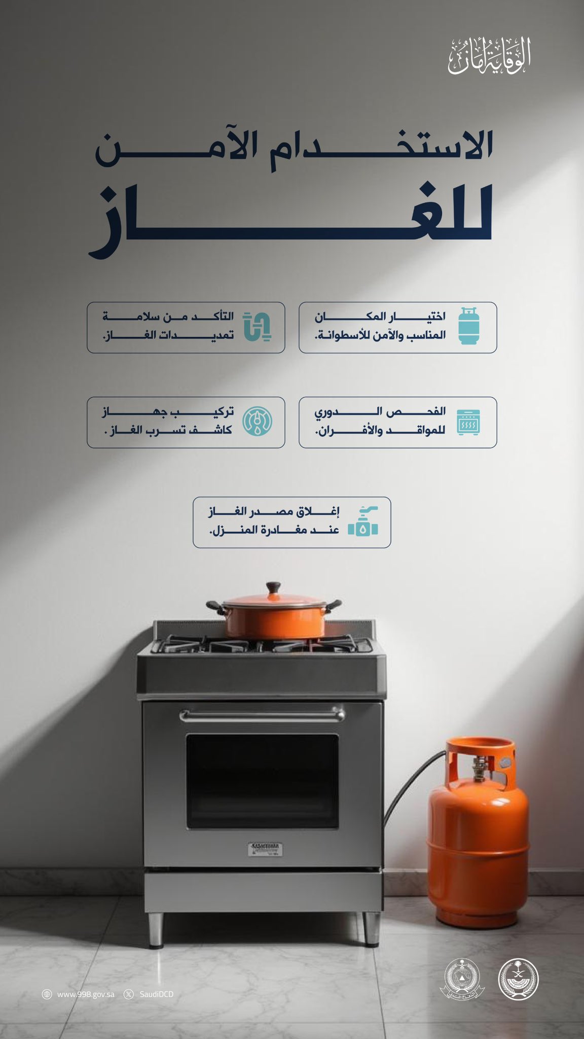 أوضحت المديرية العامة للدفاع المدني، أهمية الالتزام بإجراءات السلامة عند تسرّب الغاز، وعدم استخدام مفاتيح الكهرباء أو أي مصدر يسبب الاشتعال، وإخلاء المكان، وإحكام إغلاق صمام الغاز وتهوية الموقع بفتح النوافذ والأبواب ببطء، وتركيب أجهزة كشف تسرب الغاز في المنازل لحماية الأرواح والممتلكات.
