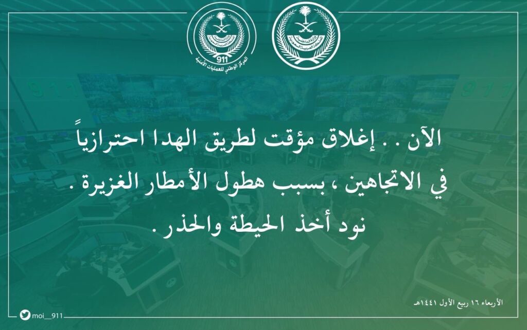 أعلن المركز الوطني للعمليات الامنية بوزارة الداخلية (911) – اليوم (الأربعاء) – عن إغلاق الجهات المختصة لطريق الهدا في الاتجاهين.