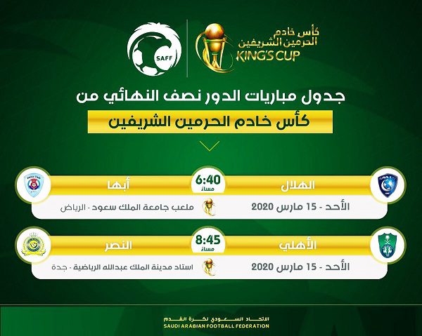 حددت لجنة المسابقات بالاتحاد السعودي لكرة القدم مواعيد مباريات دور نصف النهائي من مسابقة كأس خادم الحرمين الشريفين للموسم الرياضي 2019-2020.