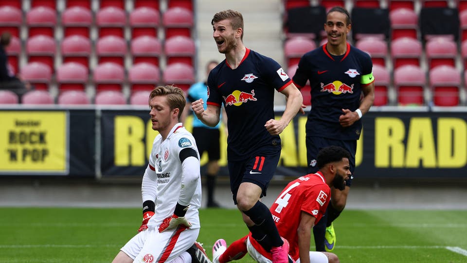 وسجل المهاجم الألماني تيمو فيرنر ثلاثية (هاتريك) ليقود لايبزيغ إلى فوز ساحق على مضيفه ماينز والصعود إلى المركز الثالث بجدول المسابقة.