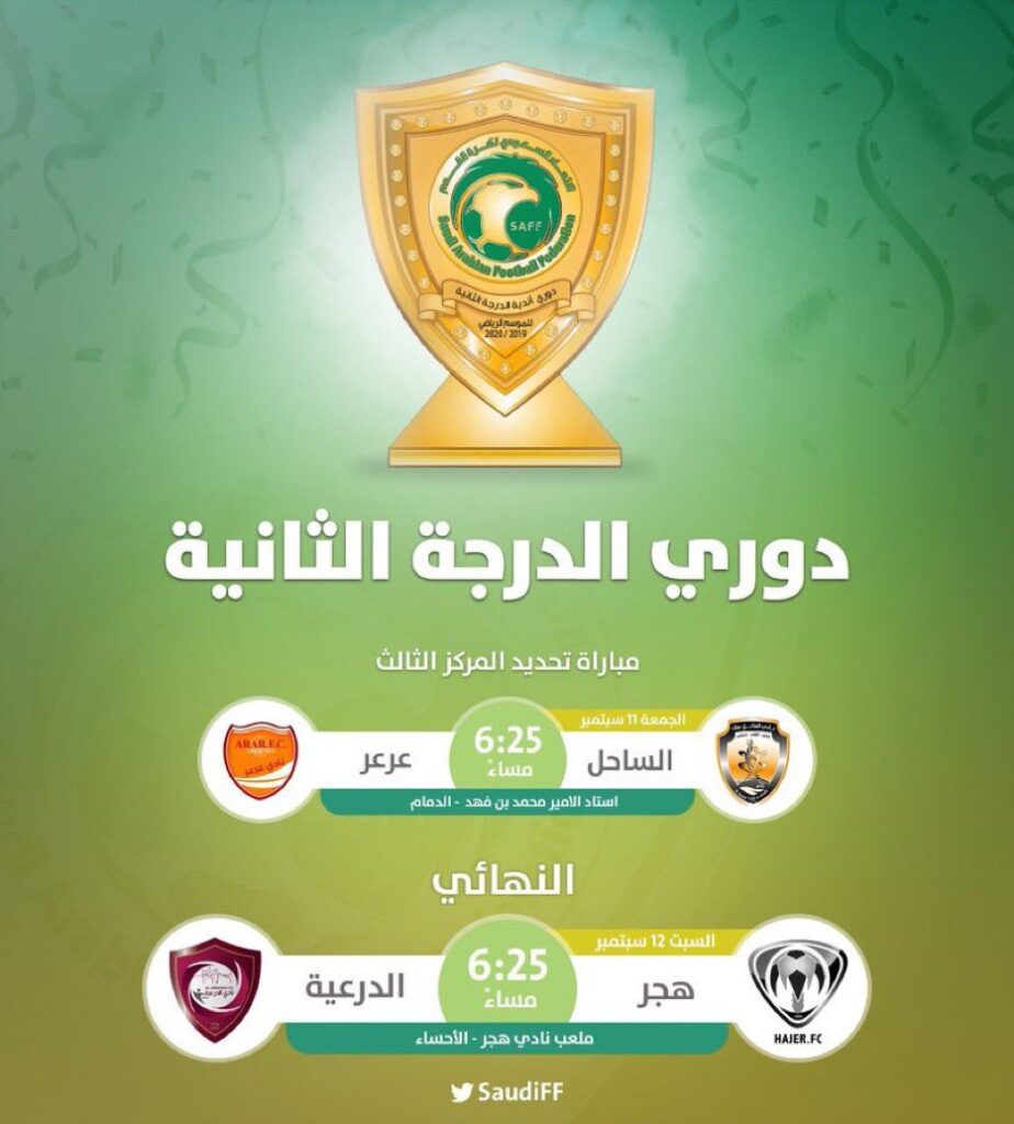 اعتمدت لجنة المسابقات بالاتحاد السعودي لكرة القدم موعد مباراة تحديد المركزين الثالث والرابع في دوري الدرجة الثانية لكرة القدم التي ستقام يوم الجمعة المقبل بين فريقي الساحل وعرعر على ملعب الأمير محمد بن فهد بالدمام , فيما ستقام السبت المقبل المباراة النهائية للمسابقة بين فريقي هجر والدرعية على ملعب نادي هجر بمحافظة الاحساء.