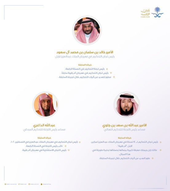 وبيّن نادي الإبل في بيان صحفي أصدره اليوم تكليف صاحب السمو الأمير خالد بن سلمان بن محمد رئيساً للجان التحكيم في مهرجان الملك عبد العزيز للإبل للمرة الثانية على التوالي بعد ترأسه لجنة التحكيم النسخة الرابعة وتكليف صاحب السمو الأمير عبد الله بن سعد بن جلوي مساعداً لرئيس اللجنة للتحكيم النهائي الذي يستهدف العروض الأخيرة أمام الجماهير في موقع المهرجان، وتكليف عبد الله الداغري مساعداً لرئيس اللجنة للتحكيم المبدئي التي تُجري التحكيم المبدئي بعد الدخول إلى موقع المهرجان وتأهيل المنقيّات إلى التحكيم النهائي.