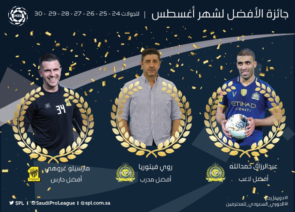 حصد البرتغالي روي فيتوريا، والمغربي عبدالرزاق حمد الله، والبرازيلي مارسيلو غروهي أفضلية جوائز رابطة الدوري السعودي للمحترفين لشهر أغسطس التي شهدت إقامة سبع جولات ابتداء من الجولة 24 وحتى الجولة 30 من مسابقة دوري كأس الأمير محمد بن سلمان للمحترفين.
