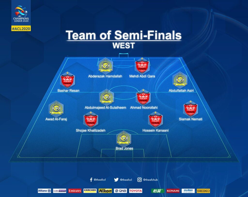 اختار الاتحاد الآسيوي لكرة القدم 5 لاعبين من النصر السعودي في قائمة فريق نصف نهائي دوري أبطال آسيا لمنطقة الغرب والتي شهدت تأهل بيرسبوليس الإيراني إلى المباراة النهائية التي ستقام في ديسمبر المقبل.