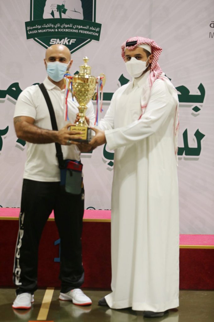 توج صاحب السمو الملكي الأمير فهد بن منصور آل سعود رئيس الاتحاد السعودي للمواي تاي والكيك بوكسينغ أبطال بطولة المملكة للمواي تاي التي أقيمت خلال المدة من 26 إلى 28 من نوفمبر الجاري على صالة إستاد الأمير فيصل بن فهد بالرياض.