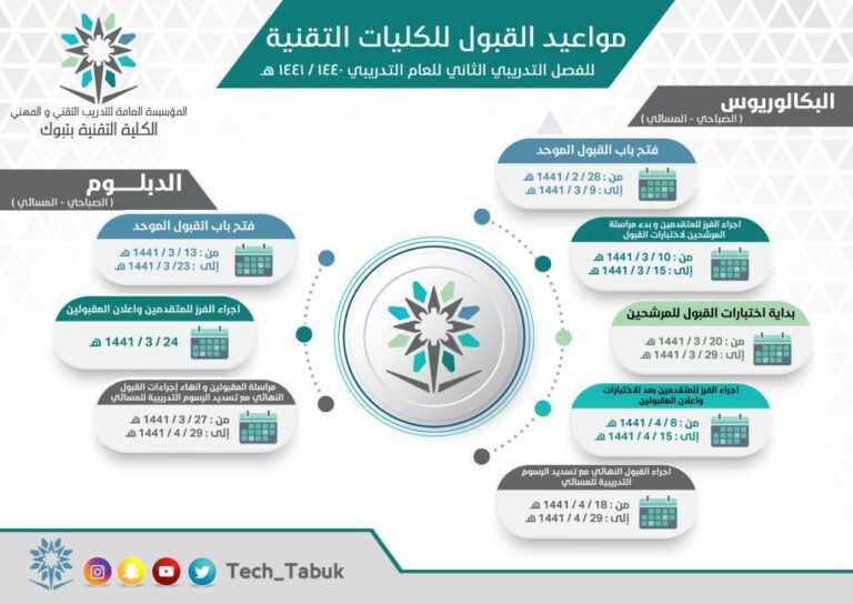 أعلنت الكلية التقنية بتبوك، عن فتح باب القبول والتسجيل إِلكترونيًا لمرحلة الدبلوم من العام التدريبي الثاني ١٤٤٠-١٤٤١هـ على أن...