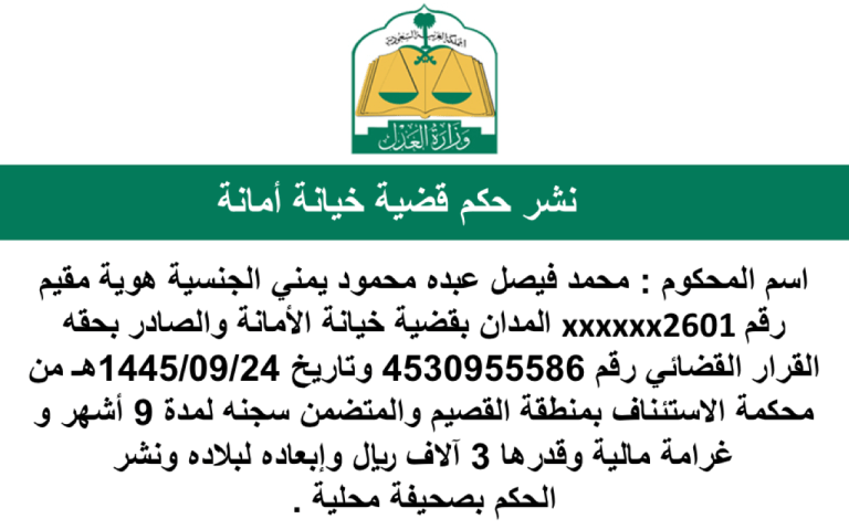 نشر حكم قضية مخالفة نظام الاحتيال المالي وخيانة...