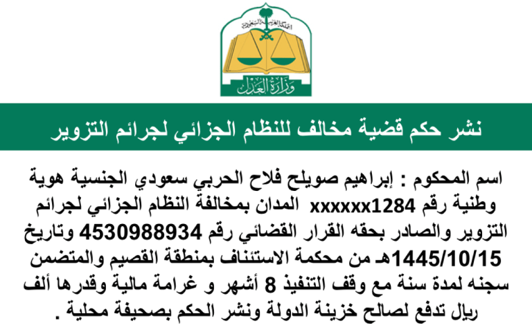 نشر حكم قضية مخالف للنظام الجزائي لجرائم التزوير