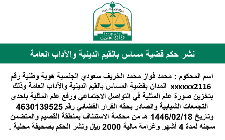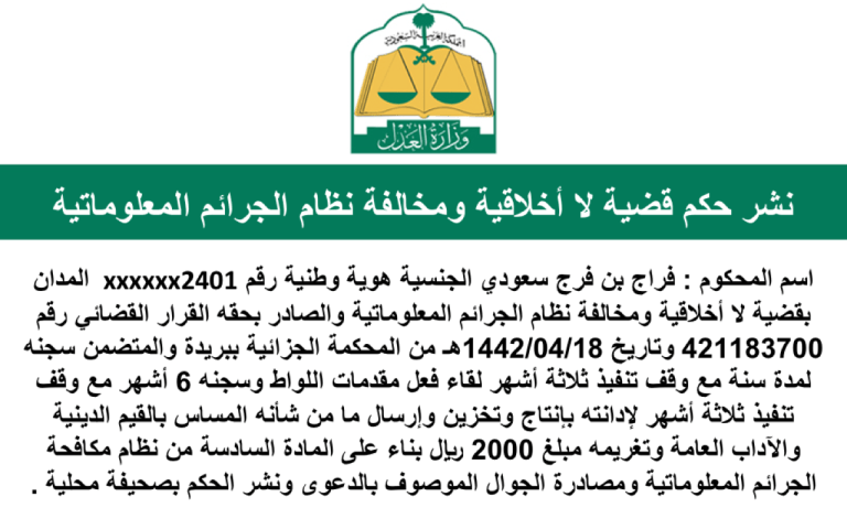 نشر حكم قضية لا أخلاقية ومخالفة نظام الجرائم...