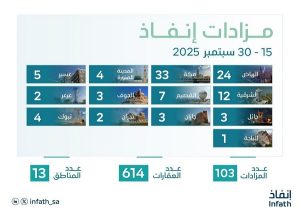 أعلن مركز الإسناد والتصفية (إنفاذ)، إقامة 103 مزادات علنية ما بين حضوري وإلكتروني، لتصفية وبيع (614) أصلًا متنوعًا في...