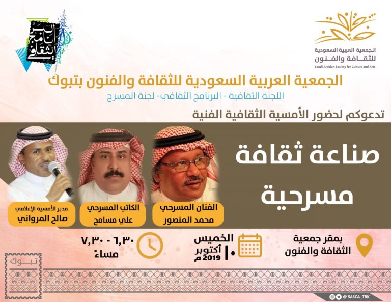 تقيم الجمعية العربية السعودية للثقافة والفنون بمنطقة تبوك ممثله في اللجنة الثقافية (البرنامج الثقافي) ولجنة المسرح مساء غدٍ الخميس...